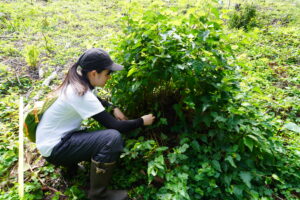 写真8-2.伐採試験地においてシラカンバ伐根からの萌芽枝発生数の調査(2023年8月23日).
