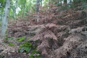 写真1-3.大滝沢試験地とその周辺にてナラ枯れが初めて観察される.最近の高温乾燥によるナラ枯れ被害の北上によって,ついに試験地にも侵入(2025年9月29日).