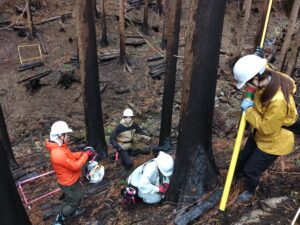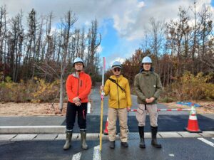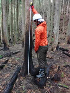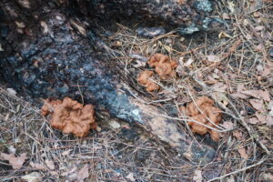 写真11-8.岩手県大船渡市で発生した山火事後の被災林分の調査(2025年9月10日).調査地はスギ林,アカマツ林,広葉樹林に設定.3枚目の写真はアカマツの根元に発生したツチクラゲ.ツチクラゲによって生き残ったアカマツもいずれ枯死する.