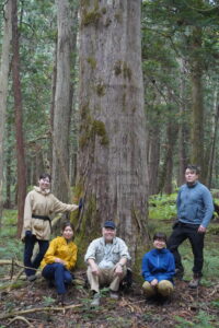 写真0-2.令和7年度の4年生3名と修士1年生(修士1年生は他にもう一人います).恐山の麓にある大畑ヒバ施業実験林に設定した無施業区内のヒバの巨木の前で(2025年10月15日).