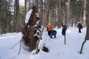 ②大滝沢試験地(岩手大学御明神演習林):4haの面積があるこの試験地は元岩手大学の杉田久志さんによって1991年に設定され,環境省による準コアサイトに指定されています。この試験地にはヒバとブナをはじめ,トチノキやスギの巨木が林立します(写真1-2)。2015年の豪雨災害により林内の各所で斜面崩壊が発生し,サワグルミが更新してきました(写真1-3)。この森林は将来,どのような姿になるのでしょうか。2021年度,森林総研東北支所と共同でサワグルミの生残・成長に関する調査を実施する予定です(お手伝いです)。