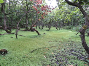 写真1-1.雪解け後に砂丘列の低い場所に出現するエフェメラル・ポンドが干上がった後.まるで庭園.枯れた木が見えるのは,おそらくこの年の夏が記録的な高温乾燥少雨のために枯れたのだろう(2021年8月4日).
