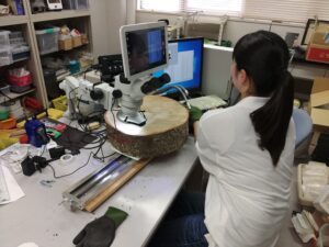 写真8-1.道総研林試の元同僚らとシラカンバの樹幹腐朽診断と伐採木から採取した円板の腐朽状況や年輪幅・数を測定したり(2023年7月~10月).