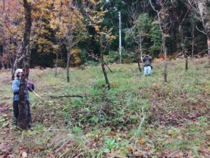 ①堀川試験地(秋田県秋田市):堀川試験地(秋田県秋田市):秋田県林業研究研修センターが,松枯れ被害地に天然更新したロマツ林に設定した密度試験地(写真2-1)で,共同研究をさせてもらっています。この試験地では,樹冠構造がもたらす林内光環と枝の枯上がりの関係についての研究を齊藤志保さん(令和元年度卒)に担当してもらい,純生産量に対する林分の密度効果について渡辺美樹さん(令和2年度卒)に担当してもらいました(写真2-2,2-3)