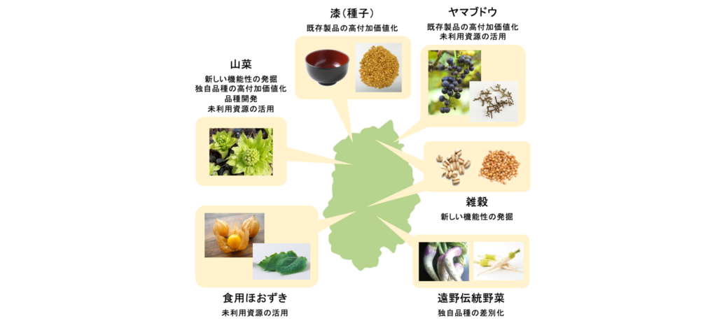 その他にも、岩手県独自の品種や伝統野菜の差別化に繋がる成分研究、機能性成分を高含有する品種の開発(成分育種)、調理加工による成分・機能性の変化の解明などにも取り組んでいます。