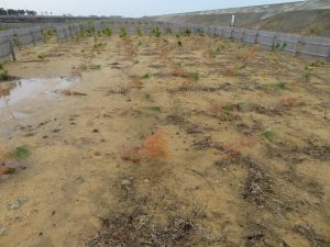 写真11-6.産廃処理場の緑化では盛土が崩れないように土を堅く転圧する(2012年5月14日).当然,樹木の成長には良くない.写真の針葉樹は冬季間に枯れてしまった.このような盛土上に加え,鉱山跡地や重粘土地のような場所に植栽可能なのはハンノキ類やイヌエンジュなど根粒菌と共生する樹種くらいだろう.