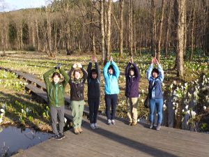 写真0-1.令和元年度の造林学研究室のメンバー.秋田からの帰路,刺巻湿原ミズバショウ群生地にて(2019年4月19日).